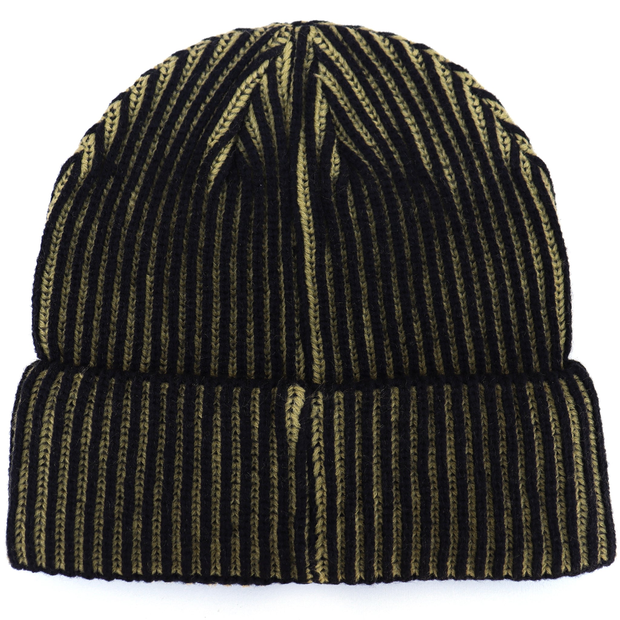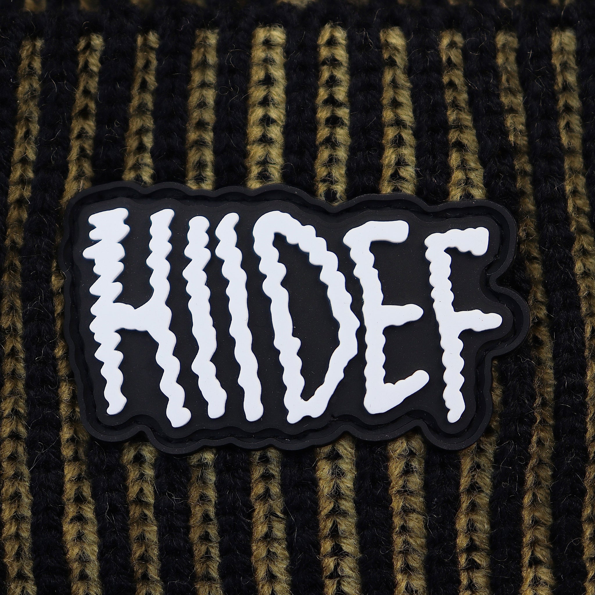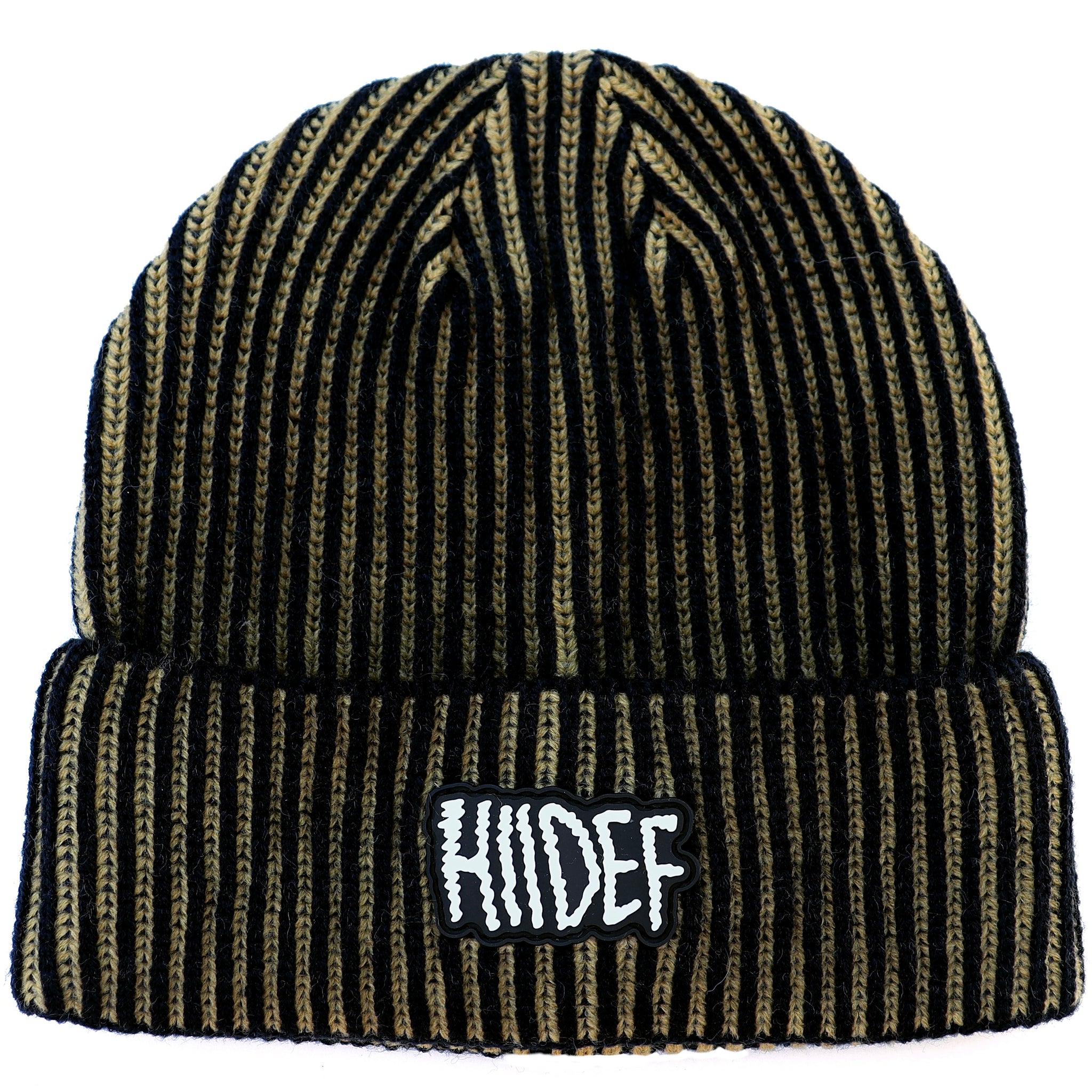 Custom contrasting black and bone colored ribbed beanie with die cut rubber Hii Def patch.