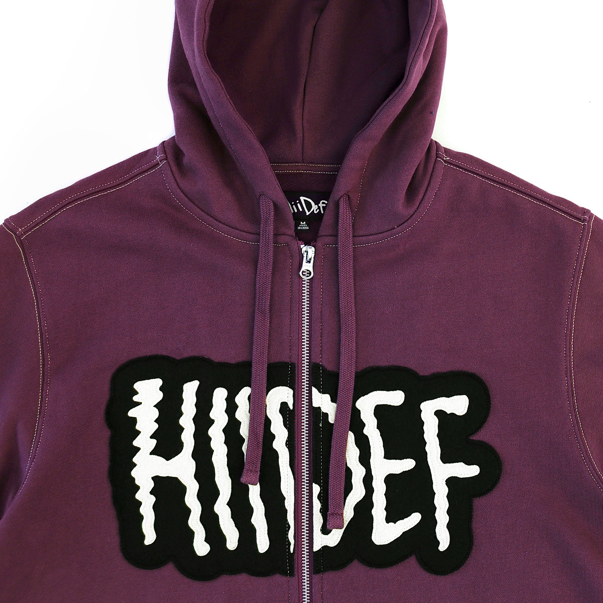 Custom 430gsm 100% cotton fleece hooded sweatshirt with contrast stitching, multi directional dual zipper, appliqué logo on chest and woven Hii Def label on left front pocket.