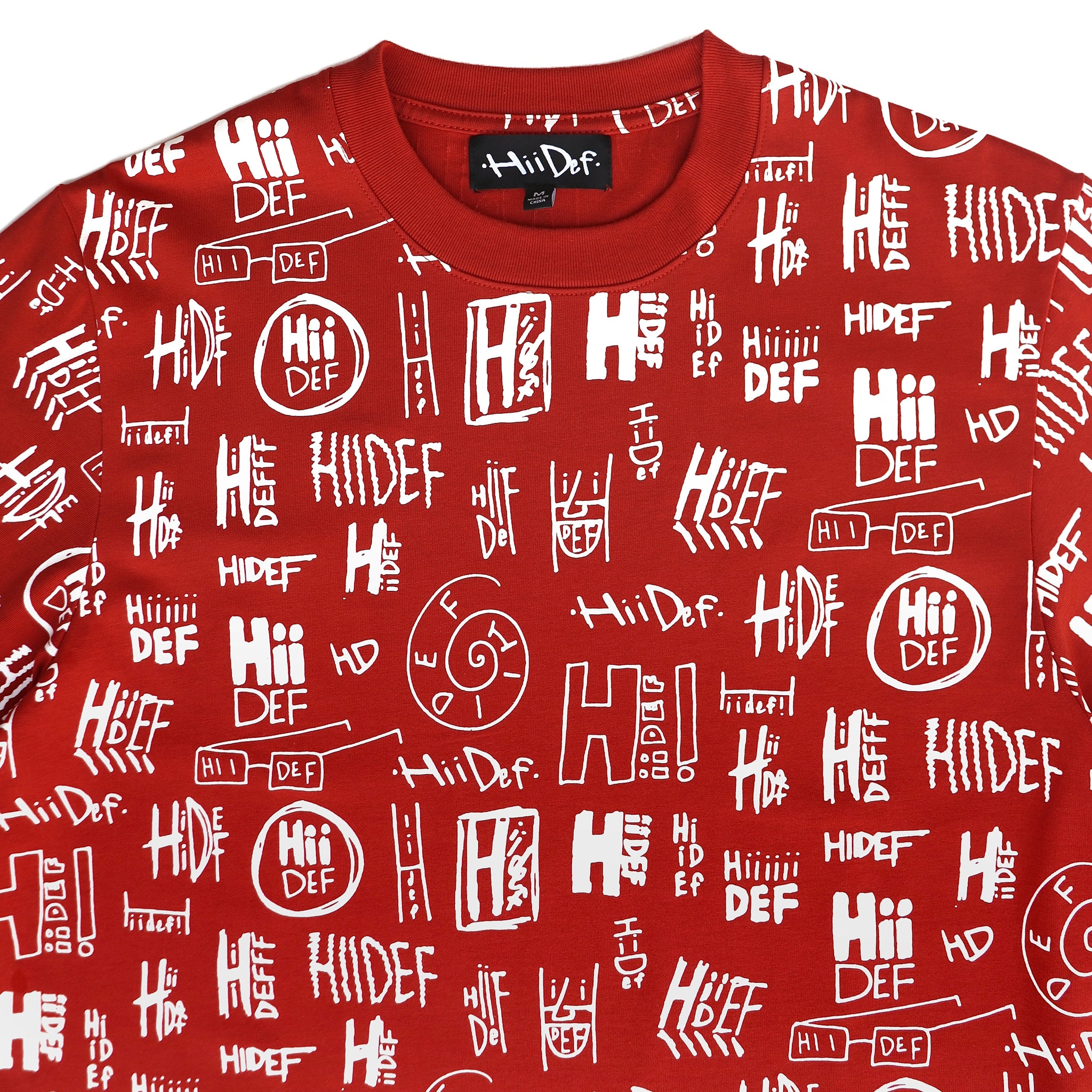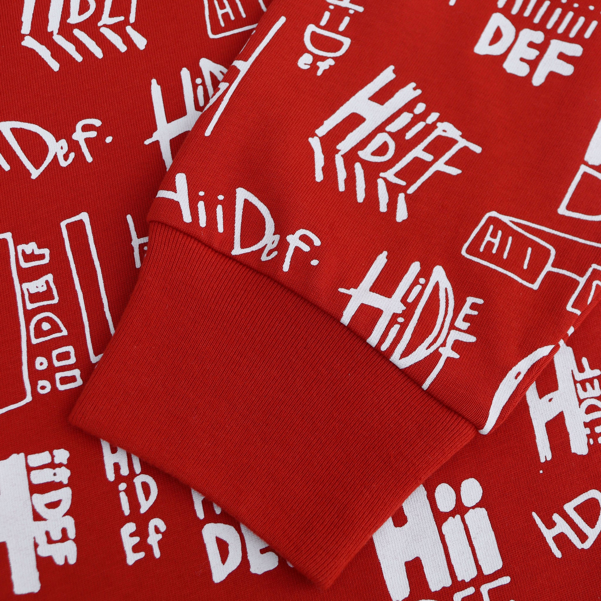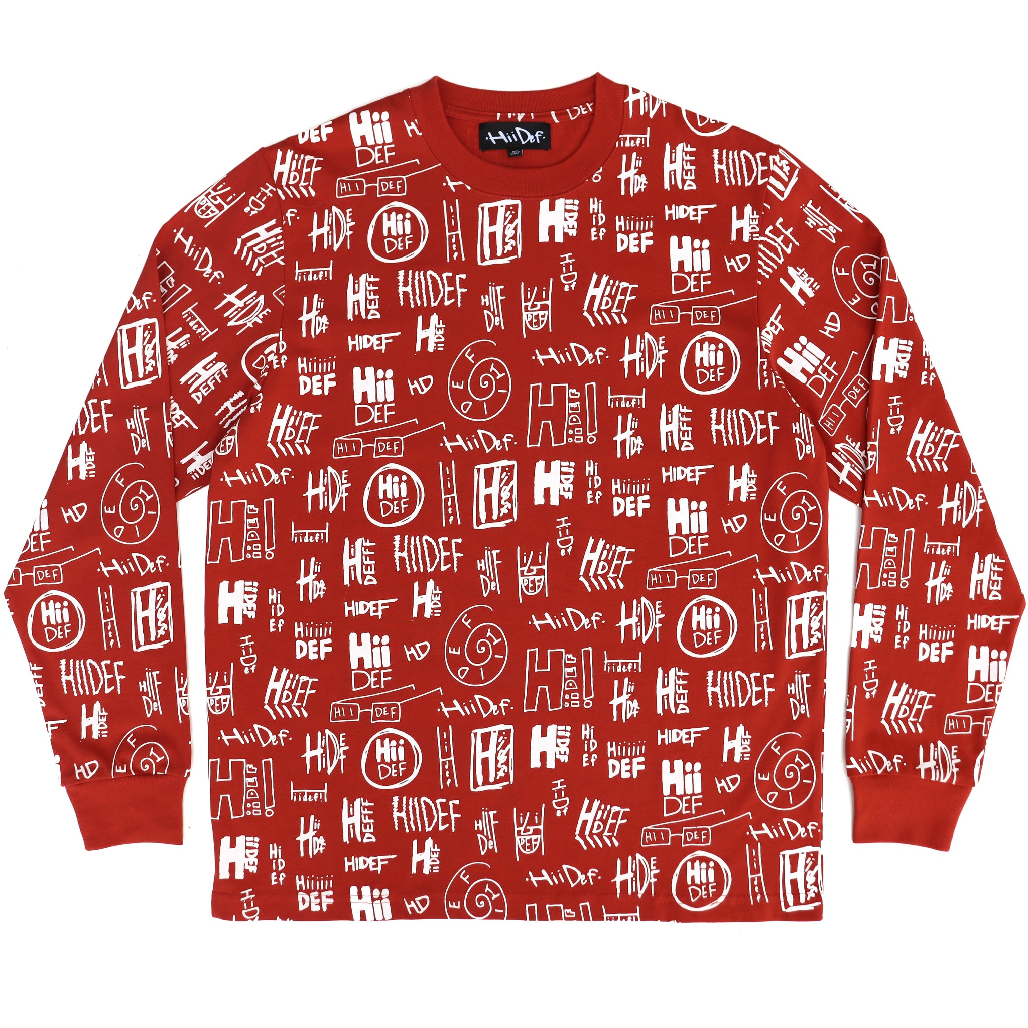 100% cotton long sleeve 6.5oz crew neck shirt with custom all over print Hii Def pattern.